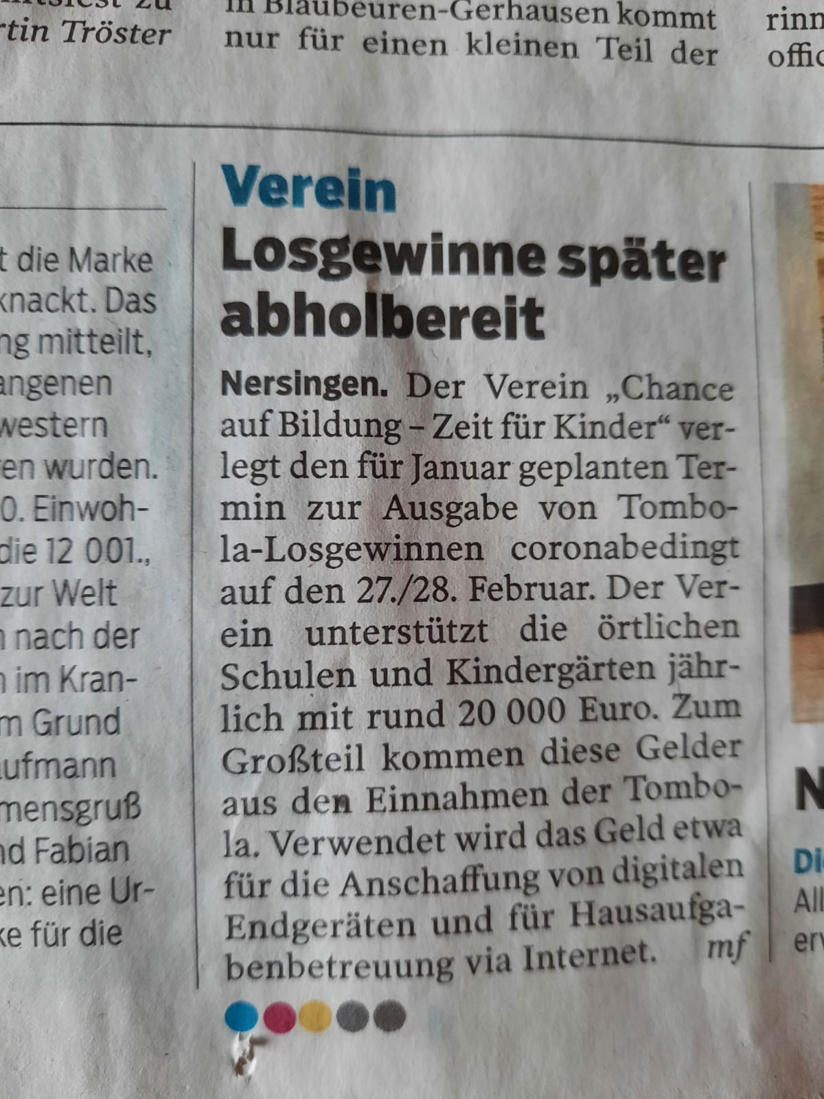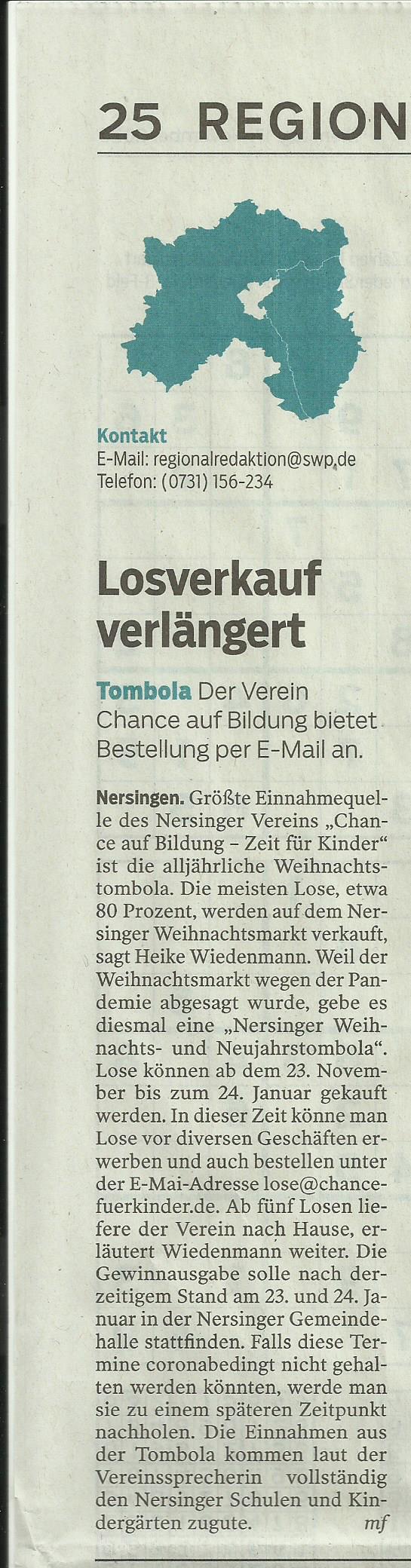 Tombola - Der Verein Chance auf Bildung unterstützt Schüler in Nersingen mit Förderangeboten.